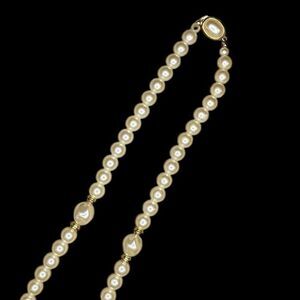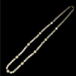 Faux pearl and gold tone necklace. Clasp has faux pearl on one side. Great vintage condition the gold is a little tarnished in places. Measures 36- 37” long