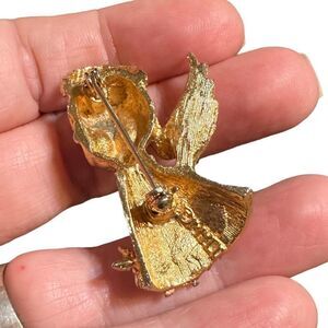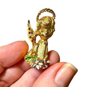 : Rare Signed MYLU Textured Gold Angel with green emerald eyes & red Rhinestones On wings holding Daisys in Excellent condition