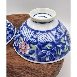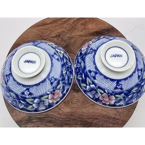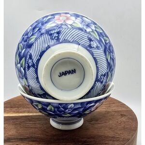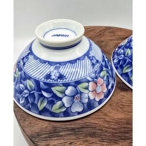 Vintage Lot Set of 2 Japanese Blue / Pink Floral Footed Rice Bowls EUC Japan