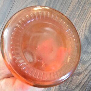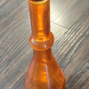 Vintage/Mid-Century Modern, marigold-orange colored glass decanter/vase. *Stopper missing. Top opening has a pour spout. Nice, collectible, stand-alone piece or use as a vase for florals or greens. DIMENSIONS: 8 3/4" tall x 1.5" opening with pour spout tapering down to 3" base. #2 and "smooth rays" impressed on bottom. "Smooth Rays" are the radiating raised lines on the bottom of the glass base...commonly seen in vintage glass pieces.