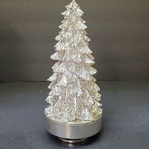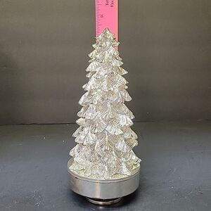 Add a vintage touch to your Christmas tree with this beautiful MCM Silvertone Metal Heavy Christmas Tree Figurine. The 8.5" tall music box tree is made of high-quality metal and features a rotating base that adds a unique touch to your holiday decor. The tree is designed in the shape of a Fir tree and has a silver color that gives it a classic and timeless look.