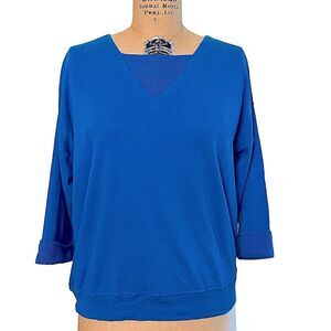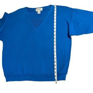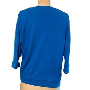 Vintage Macy’s Young Collector 80s Inset V-neck Blue Sweatshirt with elbow length turn back sleeves. Inset on the V neck matched the turn back detail on sleeve. Sweatshirt styling but lighter weight fine knit cotton jersey fabric.