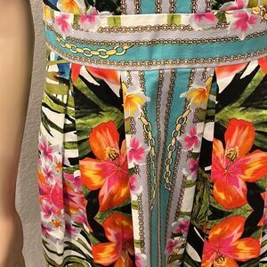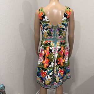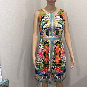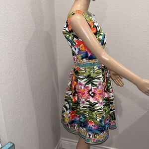 Vintage Maggy London-Colorful designer flora dress with pockets. Pit to pit 18”, length 36.5” waist 15” flat.