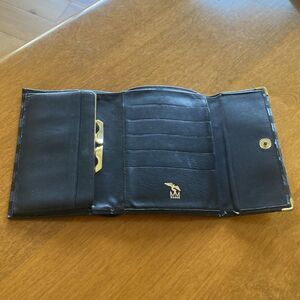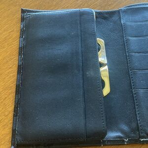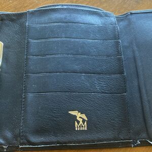 In gentle used condition. Inside has a currency sleeve, coin compartment and 6 cc slots. Measures 5.5” x 4 (closed). There are three small cracks - see the last three pictures.