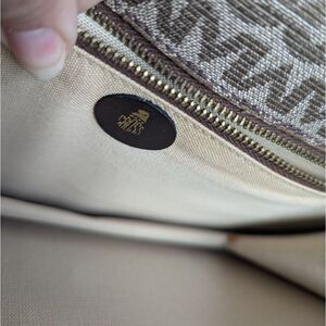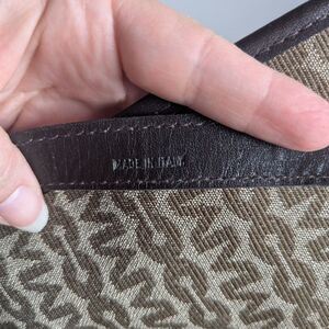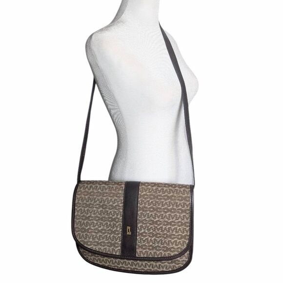Stylish and versatile brown shoulder bag perfect for any occasion. Features a slim profile. Monogram CL front flap. Leather upper and straps. Snap closure. Fabric lined with a zip pocket and two compartments. Adjustable length strap has a 19" drop, measures 8" high, 11" wide and 2" thick.