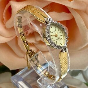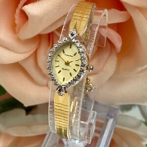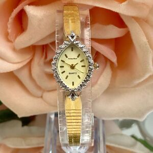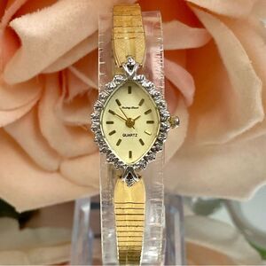Vintage Mathey Tissot diamond accented bezel cocktail watch. Watch features a gold-tone case with four tiny diamonds (setting makes it appear to be more) around the marquis shaped bezel. The dial is marked, "Mathey Tissot, Quartz," and case back is marked, "Base Metal Bezel, St. Steel Back." The watch case with bezel measures approx. 17.3mm across excluding crown, and watch with gold-tone after-market band measures approx. 6 3/4" (max wrist size of approx. 6 1/4”). The links on the band near the clasp stretch slightly. Watch is in good vintage condition with a scratch-free crystal and light scuffs / scratches to the case and band. Watch has a new battery and keeping time. Just a lovely vintage cocktail watch! Thanks for checking out my closet!