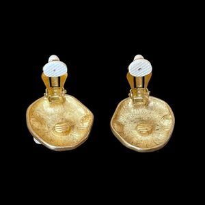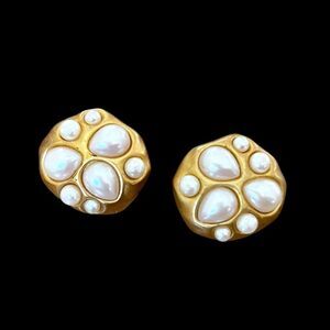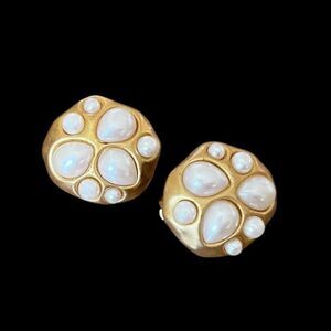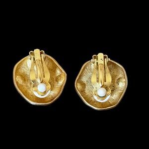 Elevate your collection with these stunning vintage clip-on earrings, featuring a bold, organic shaped design crafted in matte gold-tone metal. Each earring is set with teardrop and round opalescent pearl cabochon stones that shimmer subtly with iridescent hues. Padded backings are comfortable and secure. Unsigned. Approx. 1” diameter. There is some minor wear, overall in great vintage condition.