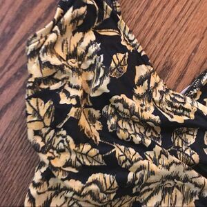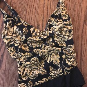 Very good condition without flaws. Size 12. Elastic is good. Metallic trim on the wrap bodice