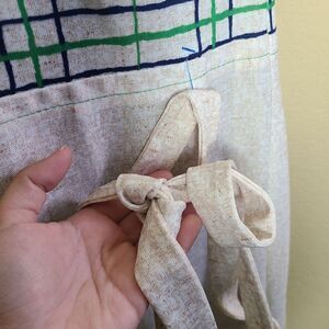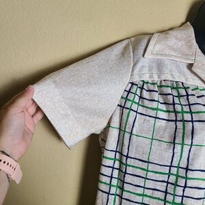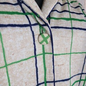This is a vintage dress by MedaMoon by Miles. It is cream with green and blue checker print. There are fabric buttons and an attached belt on this dress. Note there is no size tag on this dress, please let me know if you need any additional measurements!