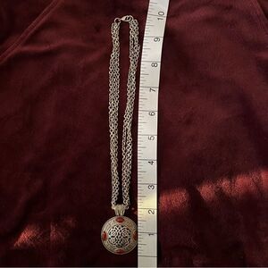 This necklace is unsigned but made well. The silvertone medallion hangs close to the throat on 3 chain 16” necklace. The stones are faux carnelian I think. Feels heavy like pewter but I don’t know.