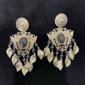 Vintage Metal Tin Silvertone Runway Feather Black Bead Stone Pierced Lightweight