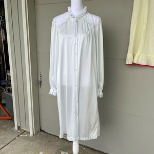 Vintage Miss Elaine button-front robe/nightgown in a soft pale blue-green shade that reads nearly white in photos. In person, it has a beautiful icy mint tint that adds to its dreamy, ethereal vibe. Made in the USA with high-quality construction and romantic detailing throughout.
