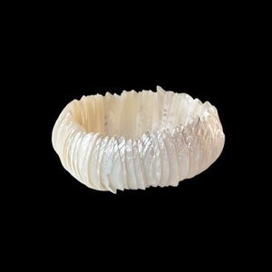 High luster mother of pearl domed half moon shaped beaded stretch bracelet. Fits a 6” wrist comfortably, 1” width. In great condition!