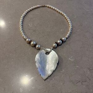 Beautiful vintage necklace featuring a carved mother of pearl leaf pendant.