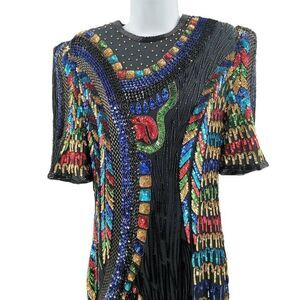 This captivating vintage dress by Eves Allure is a stunning work of art, featuring intricate beadwork and sequins in vibrant hues of red, blue, green, and gold on a black base. The bold geometric and abstract patterns flow beautifully across the fabric, highlighting the contours of the body for a glamorous, structured silhouette. Short sleeves and a high neckline add elegance, while the shimmering embellishments make it a standout statement piece for special occasions or vintage collections.