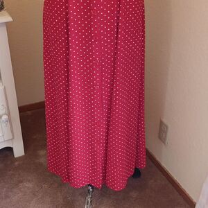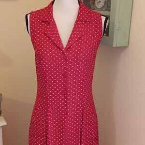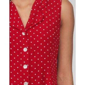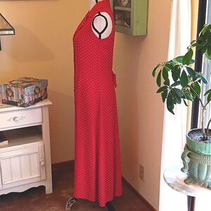This sleeveless maxi sundress by My Michelle features a vibrant red color with charming white polka dots. Stoçk photos are for style only. My dress has RED buttons. Size 9-10 measures 34 at chest, 30 at waist, tie here in back. 44 at hips, 50 long from shoulder to hem. The notched collar and buttoned front add a touch of sophistication to its breezy, lightweight design, making it ideal for warm weather.