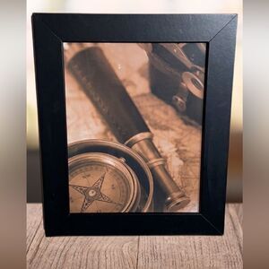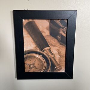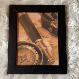 Vintage NAUTICAL BRASS SPY GLASS, MAPS AND COMPASS PRINT with black wood frame and glass face. It has a metal wire for hanging in back. It’s used but a gorgeous picture to have up in your house(I love anything to do with maps!) the brown paper in back is slightly ripped(doesn’t matter because it is hidden anyways when hung. The frame has some distress but it’s minimal and I tried to show in pics but it barely shows. You’ll love this on your wall! Measurements are in pics