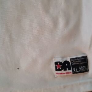 Great graphics! Does have a small hole in bottom front, and 2 blue marks inside on back (see photos) Also needs hemming in back