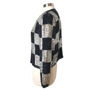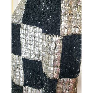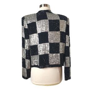 A striking vintage jacket featuring intricate black and silver sequin checkerboard patterns. Ideal for formal events or adding a bold statement to outfits.