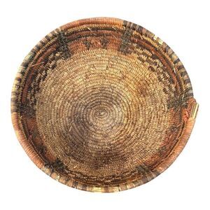 This vintage handwoven tribal African basket bowl features intricate craftsmanship. Its earthy brown and beige tones make it a striking decorative piece, suitable for a variety of settings.