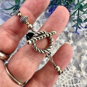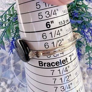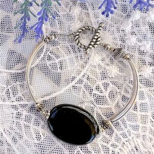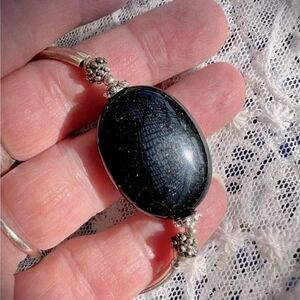 Along with the obsidian center piece are silver beads in variety - double curved tubes that show a little tarnish - I think these & some of the beads are sterling. Other beads look more like silver tone to me. The toggle clasp is silver tone & may have been placed on later. Strung on tiger tail and has a bit of an Eastern vibe - would go well with Tibetan/Nepalese pieces. I think 90’s but could be older. Shown on my 6.75” wrist - I wouldn’t go bigger. Very unique - one of the coolest pieces of Obsidian I’ve run across.
