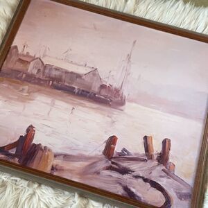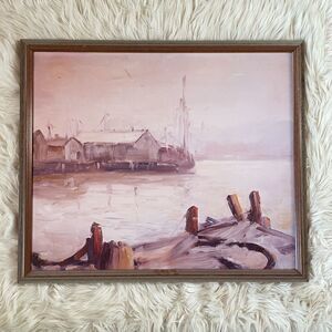 Vintage Nautical Wooden Framed Print with purple hues. Dock, sailboat and ocean setting. Absolutely gorgeous. I’m not sure about the artist’s name and I google searched it but it’s a really pretty piece. Framed in Dover New Hampshire so robably a painting of Portsmouth New Hampshire. You’ll love having this in your collection. Metal wire for hanging on back