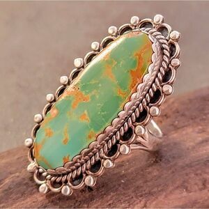 Gorgeous vintage Navajo beaded large oval rich green Royston turquoise with brown matrix statement ring. It's fun to wear on your ring, middle, or index finger. This is absolutely sterling and a striking piece!
