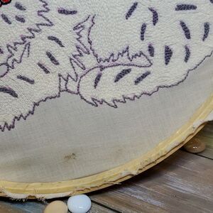 14" circular wall hanging with needlecraft work. Vintage condition. See all photos for front and back. SMALL STAIN ON BACK OF FABRIC, BARELY VISIBLE ON FRONT. I HAVE NOT TRIED TO CLEAN IT.