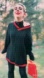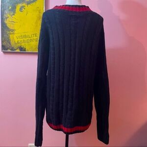 Black or dark navy wool long sleeve sweater with scarlet stripe along v-neck collar and around lower hem. Elbows have black corduroy-like cotton patches for a scholarly look.