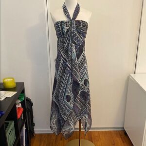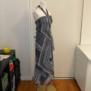 Vintage Nichii Blue and Black printed Bohemian Handkerchief Halter Midi Dress