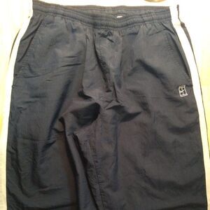 Vintage Nike Tennis Striped Mesh Lined Wind Pants Joggers Trainers, Side Pockets, Rear Zipper Pocket, Zippers At Ankles (On Inside Of Leg NOT Outside Of Leg - Pictured) - Size Large - Measures Adjustable Drawstring Elastic Waist(Flat)=15" Inseam=28" Front Rise=13.5" - Excellent Condition, No Flaws - Navy Blue Color Pants
