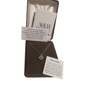 This Vintage Necklace is Silver Tone and Costume. The Chain measures 18 inches long and can be adjusted to a shorter length. The Floral Pendant is Beautiful with clear Cz stones. This is signed "Nolan Miller"