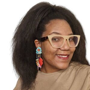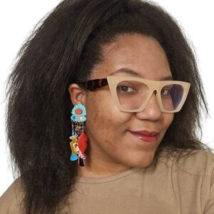 These playful vintage clip-on earrings are designed to make a statement. The unique compact-shaped top showcases vibrant enamel designs, featuring fun details like lips, lipstick, nail polish, a makeup brush, and perfume. Dangling below are abstract charms in a bright mix of colors, adding dynamic movement and an artistic flair. Crafted from mixed media materials, including metal, plastic, and enamel, these earrings are ideal for those who love quirky, standout accessories. Perfect for adding a bold, creative touch to casual or dressy outfits.