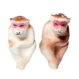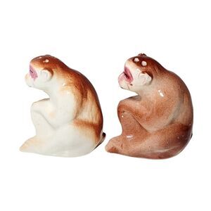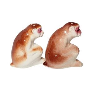 This product is a set of vintage salt and pepper shakers featuring monkeys, made of ceramic in a retro style. The set includes a salt shaker and pepper shakers, with a brown color and a theme of animals and dinosaurs. Manufactured in Japan during the modern period, these collectible shakers are perfect for all occasions and add a touch of charm to any kitchen decor.