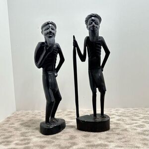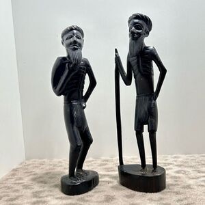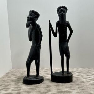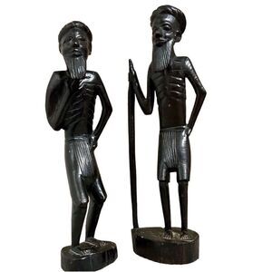 This pair of hand carved male, elderly tribesmen are in excellent vintage condition. They are carved of Ebony wood and are approximately 10” tall. The long beards are to show their age and the tribesman with the cane depicts his health.  They are beautifully carved and would make a great display or be a fine addition to your collection.