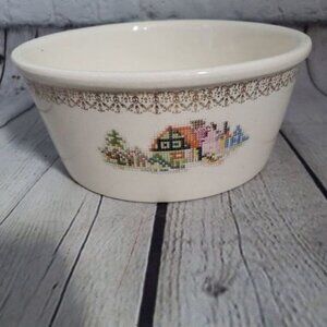 Pre-owned vintage Pantry Bak-In by Ware CROOKSVILLE #1240 cream bowl. It has a painted cross stitch house design and painted lace like border. 8". There are 2 stains inside shown in photos, and Mark's on side of lid no cracks