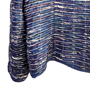 Textured patchwork blue, purple, white blazer. Medium weight. Very comfortable. Fits like a medium / large.