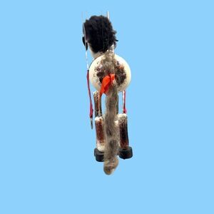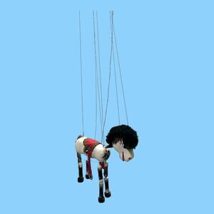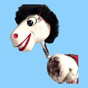 This vintage wooden marionette horse puppet is a delightful collectible. With its charming yarn mane and long tail, it adds nostalgic appeal to any collection. The puppet's well-crafted details and classic design make it a fine example of traditional marionette craftsmanship, suitable for display or creative play.