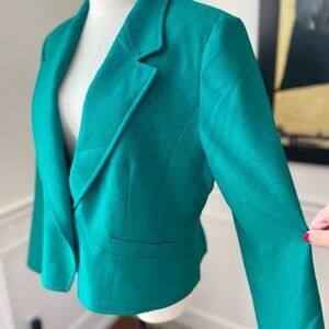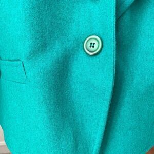 Vintage Pendleton 100% virgin wool single button blazer in a vintage green tone. Lined. The vintage size is 16 petite however vintage sizing runs small so it is closer to a medium petite in modern sizing. Measurements are approximate and taken while laying flat: 22.5 inches from shoulder to hem, 20.5 inches from armpit to armpit and 23 inches shoulder seam to cuff