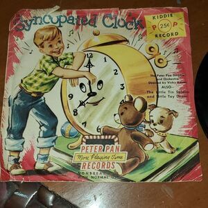 This is a vintage Peter Pan Records The Syncopated Clock and The Little Tin Soldier album. It is numbered 392A on one side and 392B, 357A on the other side. Record plays on both sides, shows wear, and cover is ripped and torn. See pics.