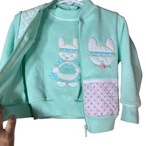 Vintage Petite Club 2 piece Matching Bunny Print Vest and Sweater 24 months. Bunny print sweater and matching vest. Blue/green color. Good condition!