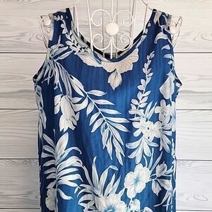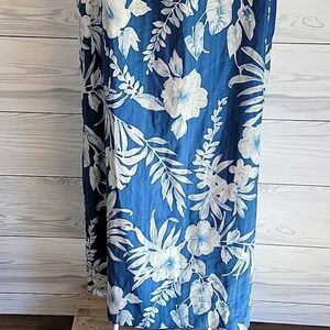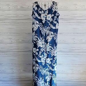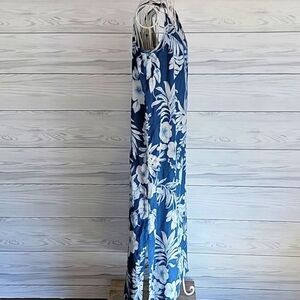 Elegantly casual blue maxi dress with a white tropical floral pattern in a sleeveless design featuring a round neckline, side walking slits, and a back zipper closure. Great pre-owned condition.