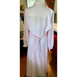 Lovely vintage handmade maxi dress in sheer pink and pink material. Not positive it is chiffon but it doesn’t hold wrinkles so it probably is chiffon. Small size, probably current 4-6 ladies size. It good condition.
