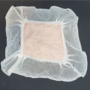 Vintage pink handkerchief with white mesh trim. Size: 9" x 9" Damaged as shown in pictures.