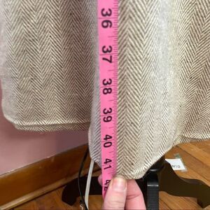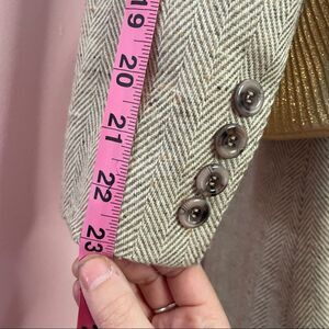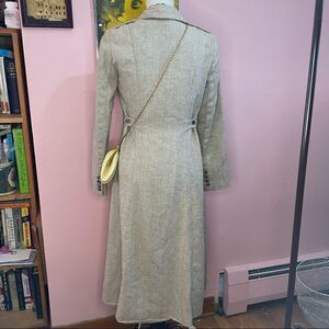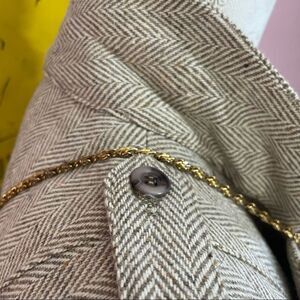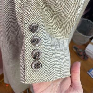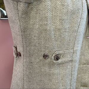 Romantic 1930s vibes. Tan and cream herringbone woven wool and acrylic blend. Fully lined. Has side straps with buttons at waist to tighten silhouette. Four button details on each cuff, five button down front, tortoiseshell buttons, notched collar. Buttoned epaulettes at shoulders. Slip pockets at hips.