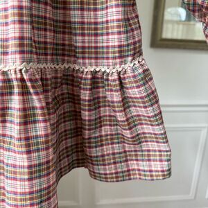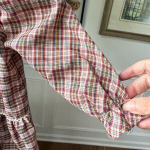 Vintage poly Flinders, brick, red and ivory plaid long sleeve dress with ruffle neck and smocked yoke. Ric rac trim. Back button closure. Tag size 3T.