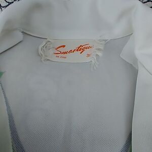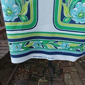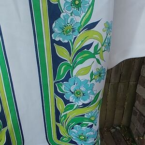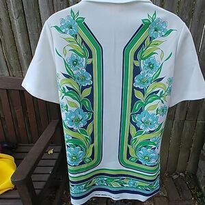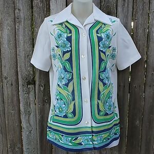Hang ten in this sweet poly Hawaiian shirt with aqua flowers and blue and green racing stripes. Tag says Smartique. Has a few minor picks. Needs some re-hemming at the bottom (or just let it hang). Measures flat: bust 19", collar to hem 18".