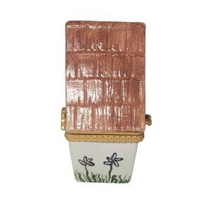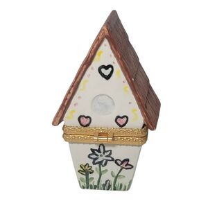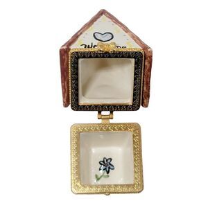 Vintage Porcelain House Shaped Hinged Trinket Pill Box Handpainted Flowers 4".