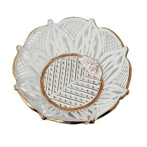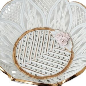 Vintage Porcelain Wicker Style Trinket Basket Floral With Gold Accent 2" x 4".