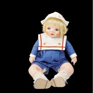 This is a porcelain blue eyed child with a sailors hat and clothing. Dimpled cheeks, open mouth, long eyelashes.